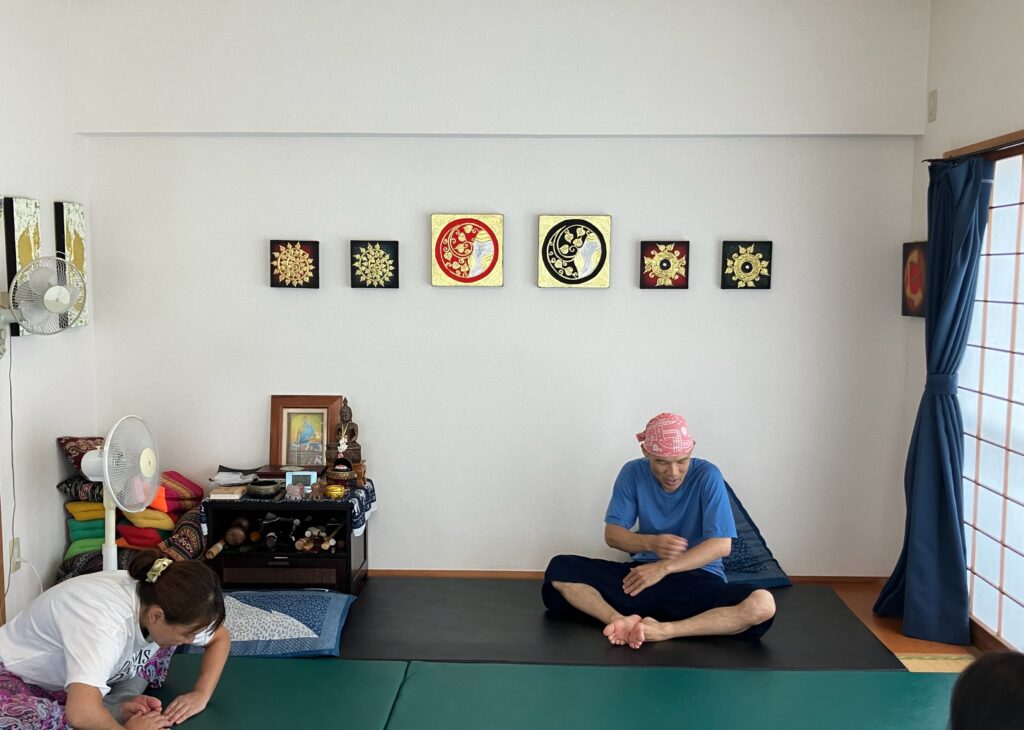 講習を受けてきました。十分な安定した持続圧をかける方法、ポイント、施術者の体の姿勢、重心の位置、など、、、よりいっそうの深いリラックスのために、、、、。頭に手拭…
