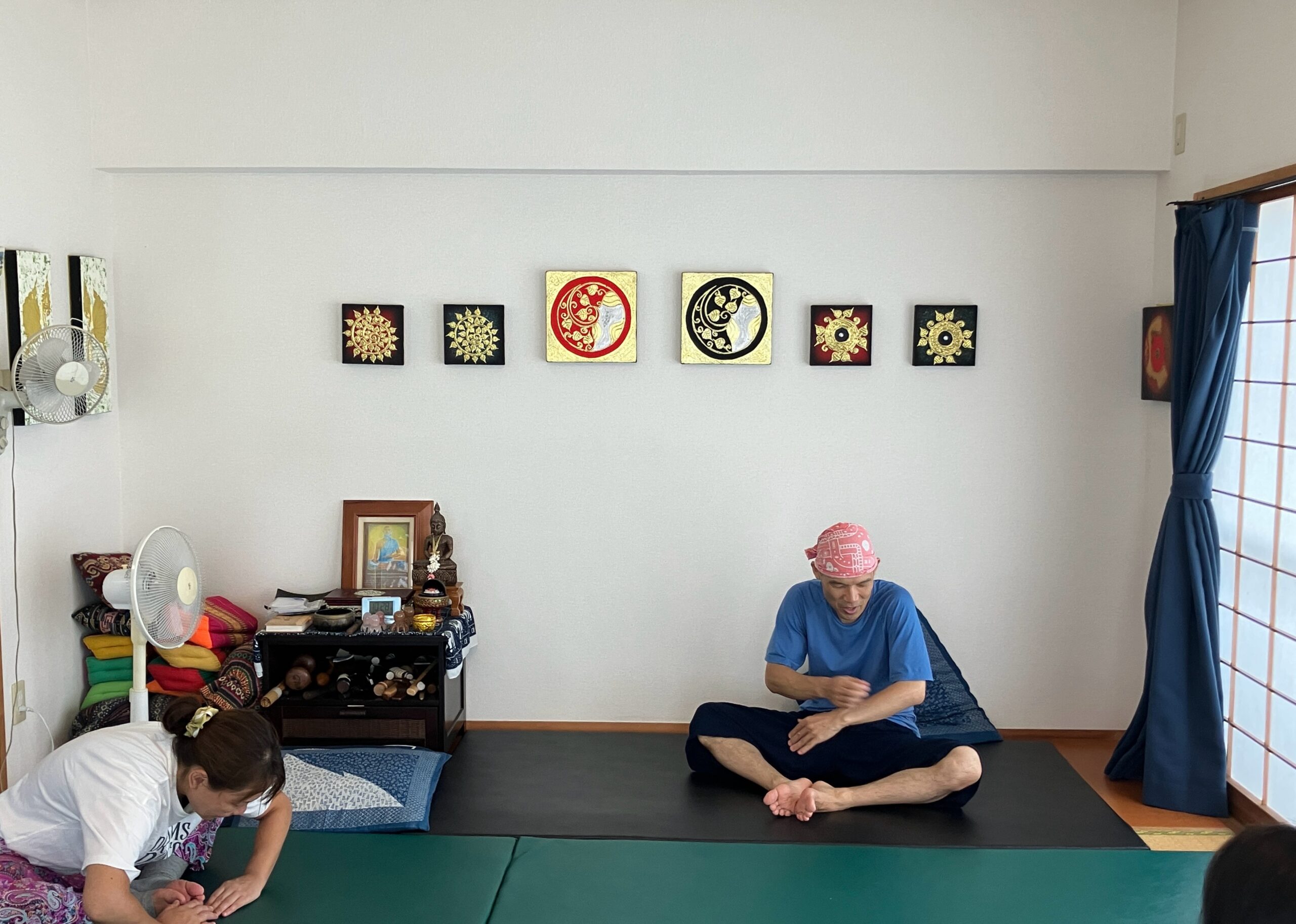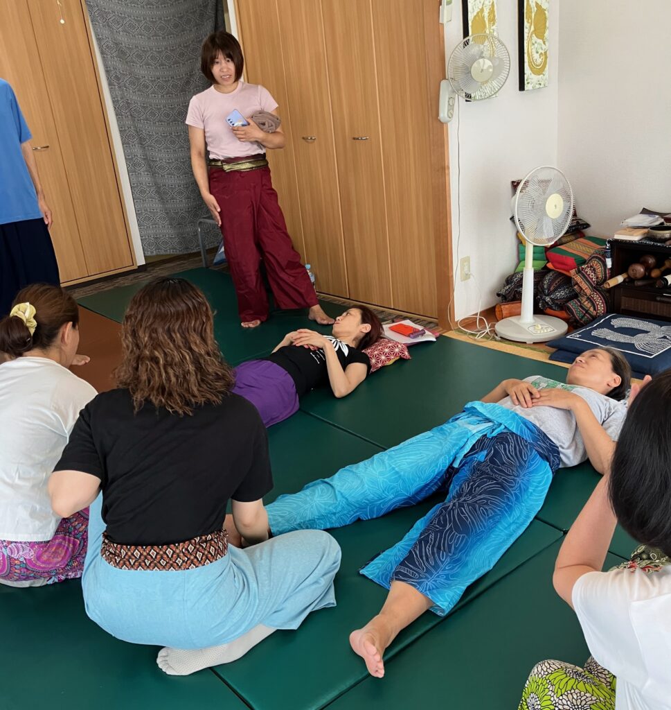 講習を受けてきました。十分な安定した持続圧をかける方法、ポイント、施術者の体の姿勢、重心の位置、など、、、よりいっそうの深いリラックスのために、、、、。頭に手拭いを巻いているのが北村先生です。北村先生は、お若いころから(地球の歩き方しか情報がなかったころから)チェンマイに通いマッサージ学校の門をたたき、(文字通りたたいたんでしょう、ネット予約などない時代だから)町のマッサージ店の施術を受け、あらゆるタイの食事を試し、チェンマイのマッサージ店で働き、マッサージ学校の先生になり、今も休みなくチェンマイのテクニックを教えています。すばらしい先生!